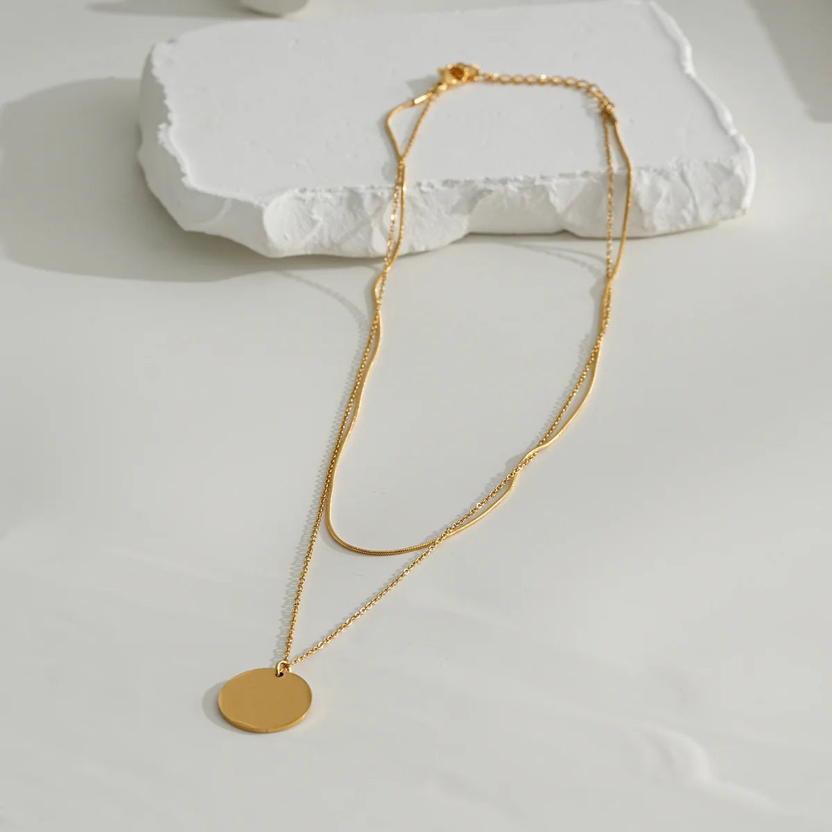Un collier double chaîne, minimaliste et fluide, avec sa médaille dorée à personnaliser ou à garder vierge, comme un symbole de pudeur.